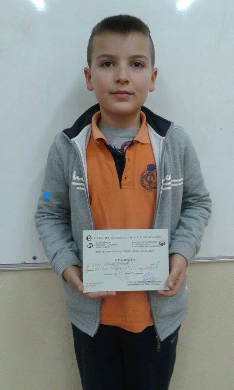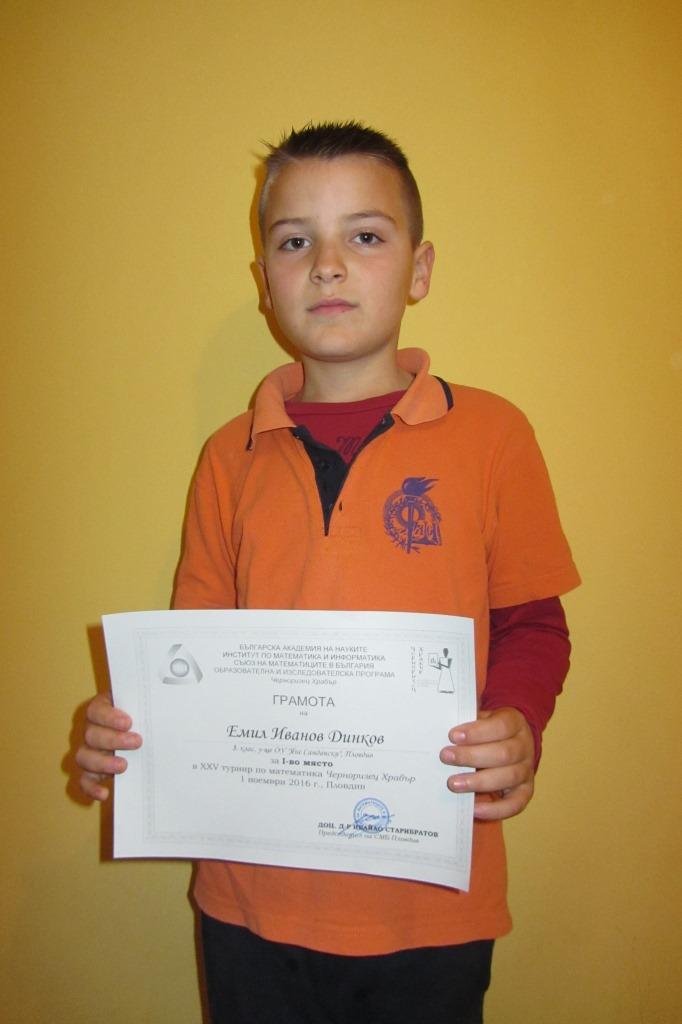 Първо място на математически турнир“Черноризец Храбър“, 2016г. за Емил Динков от 3д клас.