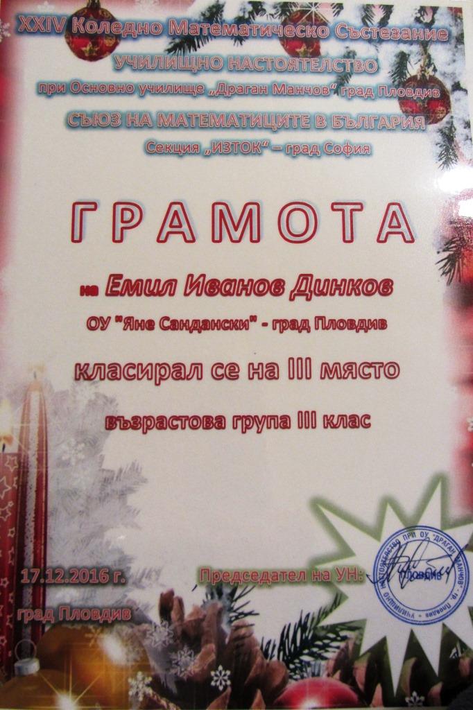 Емил Динков (3д клас) – трето място на коледно математическо състезание.