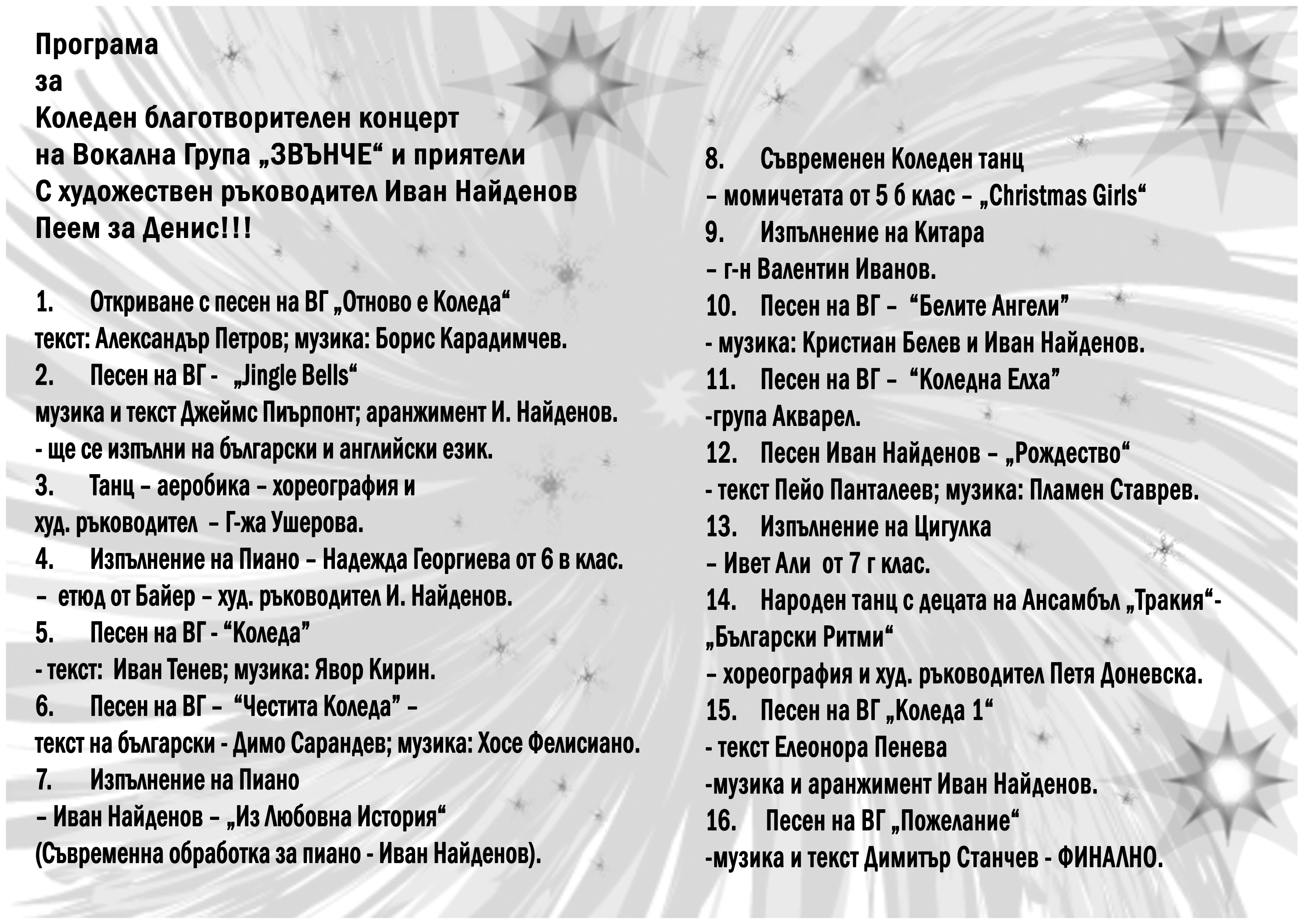 Отправяме Ви най-сърдечна покана за тържествен концерт, организиран специално в подкрепа на ученика Денис Еминов, който страда от злокачествено заболяване.